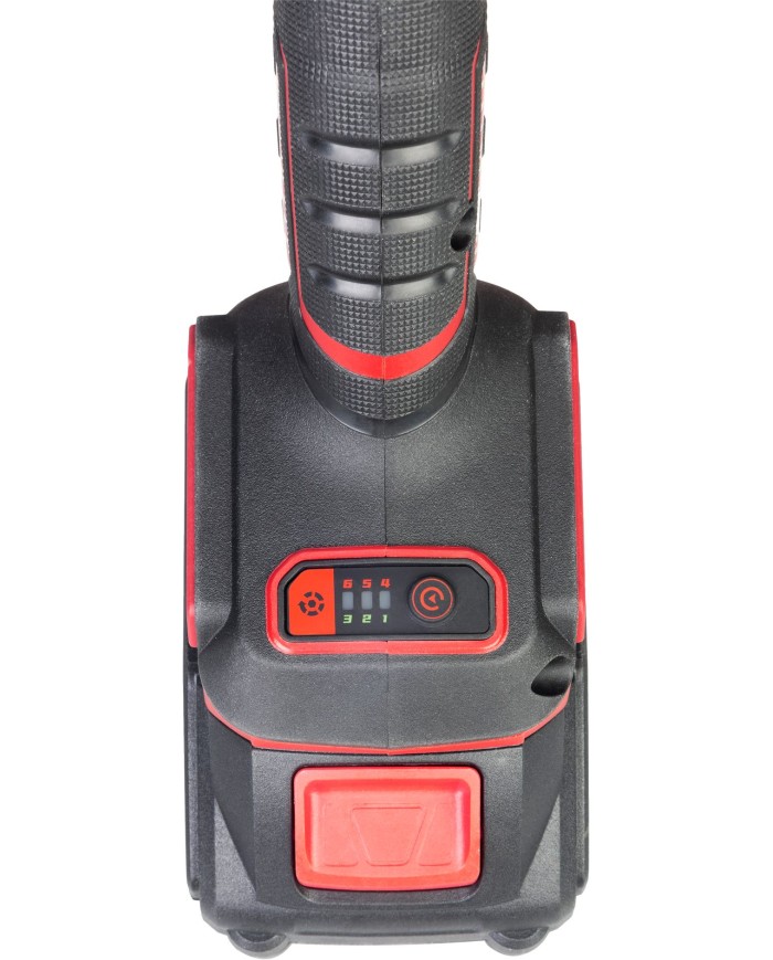 - Bezpečnostný systém – pri preťažení, prehriatí, skrate alebo vložení akumulátora so zapnutým spínačom sa zariadenie zastaví a LED indikátor bliká.
