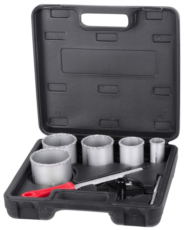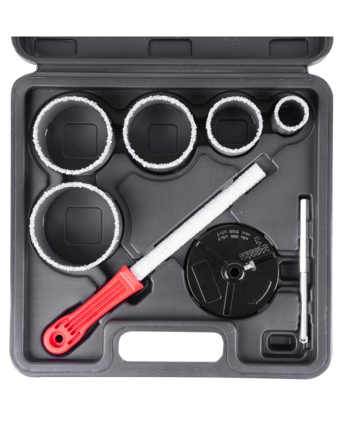 Sada vyrezávačov s unášačom HT01-6008, 33-53-67-73-83 mm, diamantové korunky s pilníkom