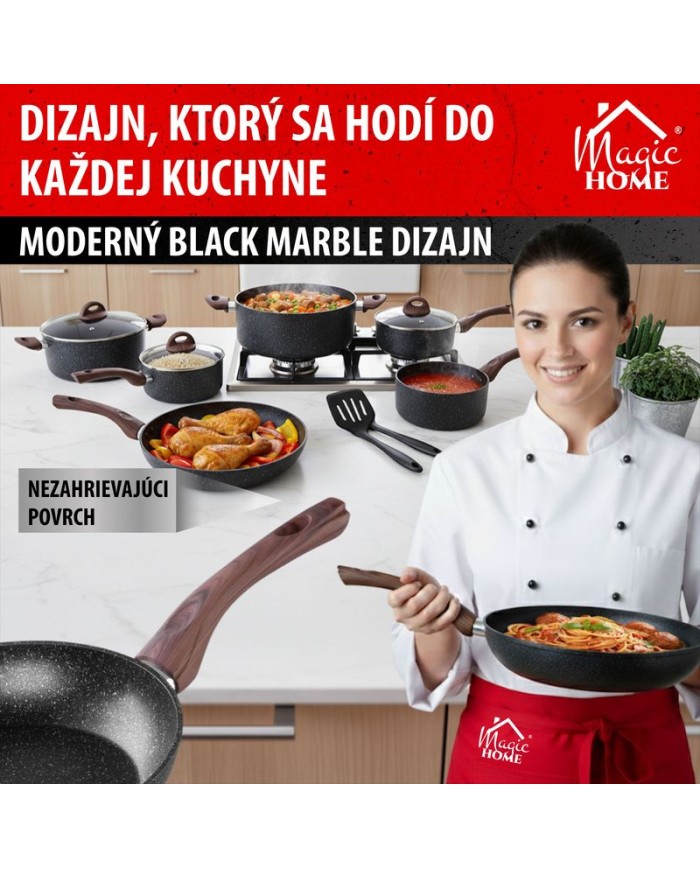 Ak si potrpíte nakvalitnékuchynské riady, táto panvica je pre Vás ako stvorená. Panvica MagicHome Black Marble Line jevyrobená zo zliatiny hliníka s nepriľnavým povrchoma3-vrstvovým mramorovým náterom. Má3 mm indukčné dno, ktoréšetrí energiu. Rukoväť obsahuje drevený náter s ochranou proti plameňu. Panvica jevhodná na všetky typy sporákov: indukcia, elektrika, plyn, sklokeramika a halogén a je tiež vhodná do umývačky riadu. Nevhodná do rúry. Ješetrná k životnému prostrediu, neobsahuje PFOA, PFOS, VOC, PB ani CD. Priemer: 24 cm.