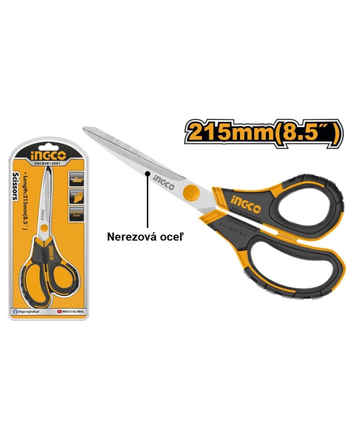 univerzálne nožnice pre domácnosť, dĺžka 215mm, majú ergonomickú rukoväť INGCO, čepeľ z ušlachtilej nerezovej ocele, hrúbka čepele 2,5mm