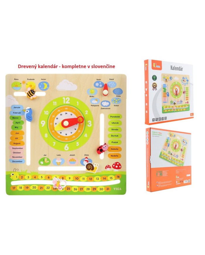 Drevený kalendár so slovenskými názvami. V kalendári sa dá naučiť hodiny, dni, mesiace, ročné obdobia, počasie a čísla. Rozmer balenia cca 30 x 30 x 3 cm. Vek 3+