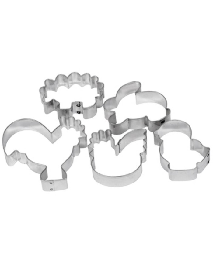 5-dielna sada veľkonočných vykrajovačiek z pocínovaného plechu, v sade sú rôzne tvary zvieratiek- kohúta, sliepky, barana, kuriatka, zajaca, rozmery cca od 4,5-6,5 cm