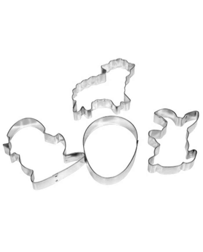 4-dielna sada veľkonočných vykrajovačiek z pocínovaného plechu, v sade sú rôzne tvary - vajíčko, ovečka, zajac, kuriatko, rozmery cca od 5-6 cm