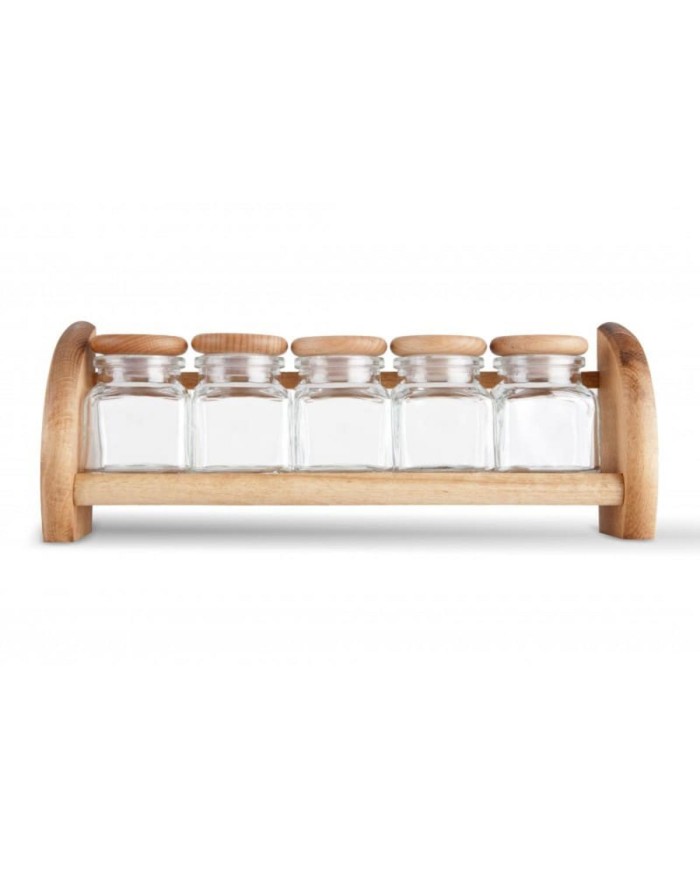 sklenené nádoby na rôzne korenie s dreveným vrchnákom na drevenej poličke, 5 ks