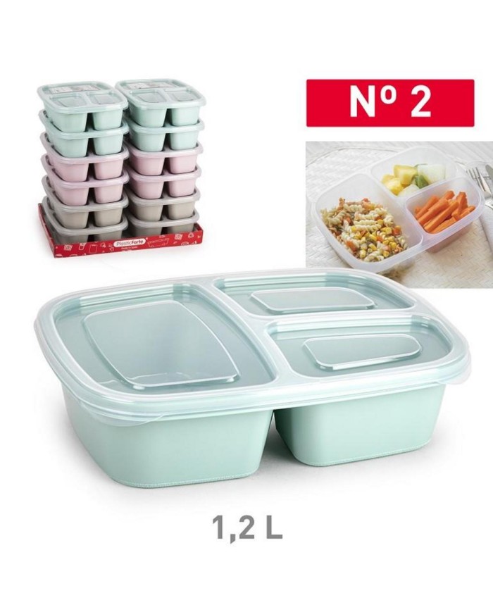 Dóza na obed, objem 1,2l, materiál plast PP, 3 priehradky na hlavné jedlo a dve na prílohy, mix pastelových farieb: zelená, ružová, hnedá