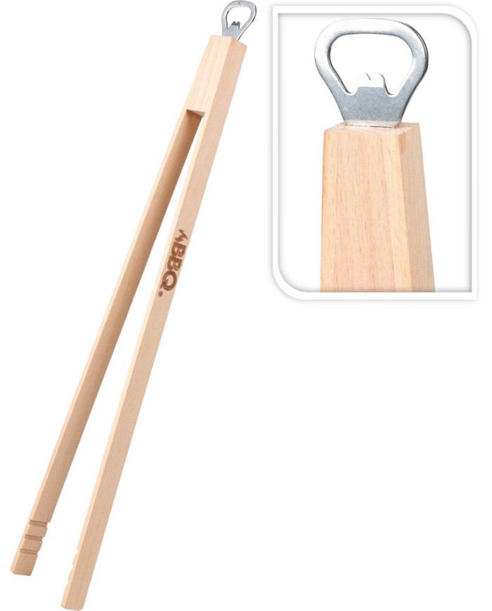 drevené kliešte na obracanie, rozmery 48x7x2 cm, s otváračom na fľaše z nerezovej ocele
