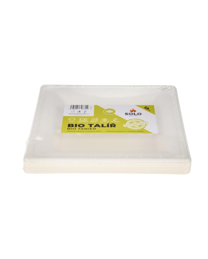 Tanier hranatý sada 12ks, v kartónovom balení 12bal, jednorázový bio, prírodný z cukrovej trstiny, 100% rozložiteľne. Vhodné do mikrovlnky, maximálna teplota do 100 °C