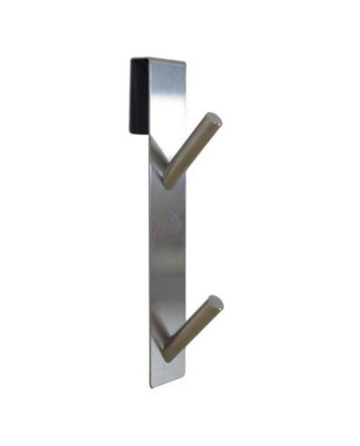 Vešiak s dvoma háčikmi, nasaditeľný bez vŕtania. Rozmery: 17,5x1x3cm. Maximálne zaťaženie 2 kg. Farba: strieborná. Materiál: oceľ.Vhodný na zavesenie do sprchového kúta, maximálna hrúbka dverí 1 cm