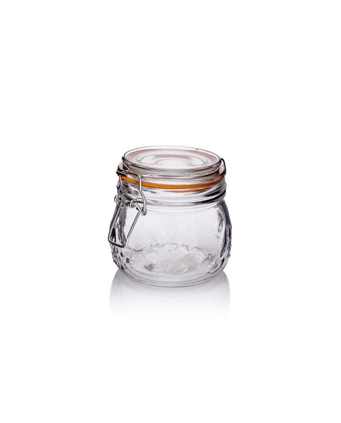 sklenená dóza so skleneným viečkom, súčasťou je kovový uzáver s klipom a gumovým tesnením, objem 500 ml, okrúhly tvar, priemer 10 cm, výška 11cm, hodí sa na konzervovanie rôznych potravín, aj na zaváranie, sklo je vzorované