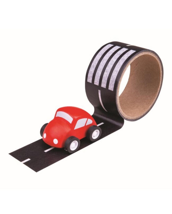 Ľahko použiteľná cestná páska, stačí ju odlepiť a prilepiť na ľubovoľné miesto. Ľahko sa dá odtrhnúť. Je vhodná na podlahu aj nábytok, nezanechá stopu a ani nepoškodí povrch. Dĺžka pásky je 8 m. Súčasťou pásky je tiež drevené autíčko - mix farieb.