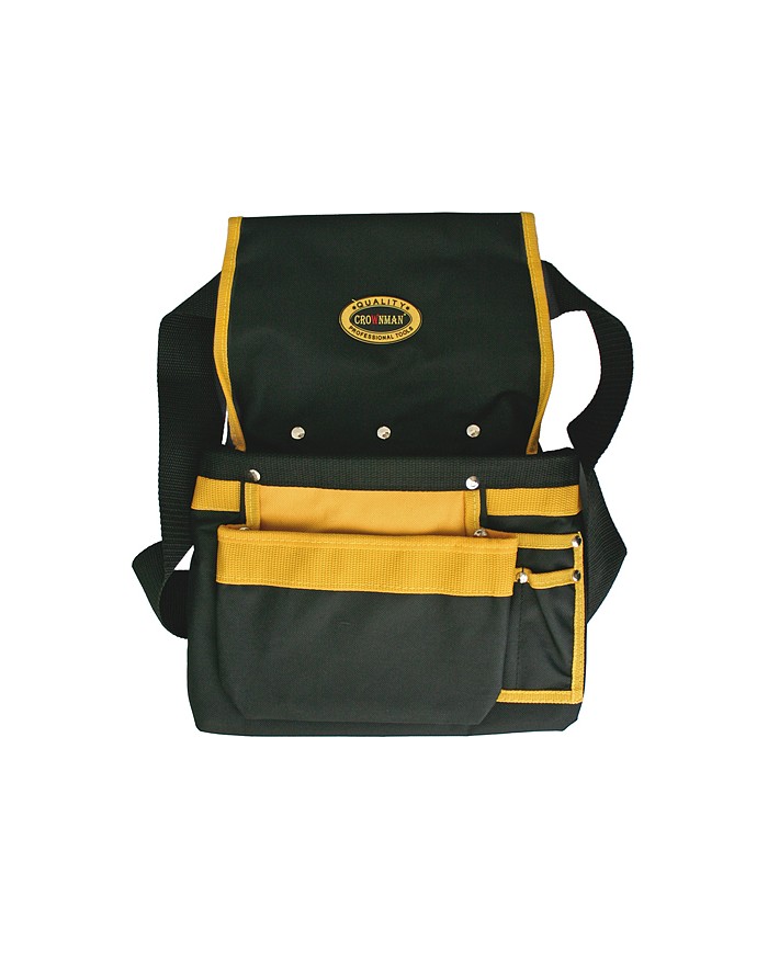 Kožené puzdro na náradie na opasok v čierno-žltej farby s hlavným úložným priestorom vo vnútri a dodatočnými na boku vaku.Ná dve úchytky pre pohodlné uchopenie a prenášanie.