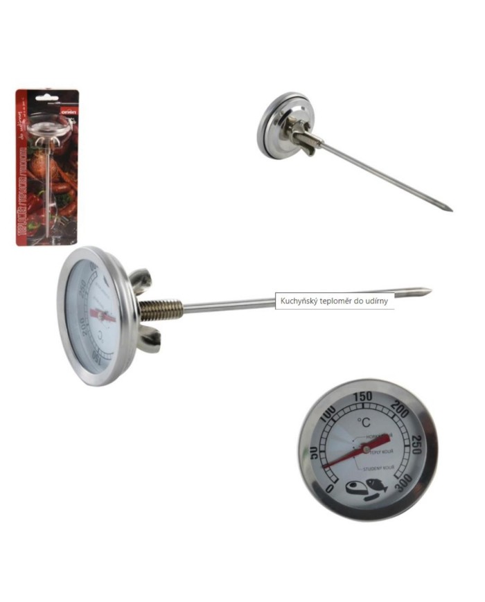 Teplomer do udiarne postráži správnu teplotu pri príprave mäsa. Prevŕtame dvierka udiarne a pomocou matky upevníte teplomer. Výhodou je jeho predĺžený hrot, ktorý zaručí objektívne meranie teploty vo vnútri udiarne a nie u dvierok, kde je teplota ochladzovaná od vonkajšieho vzduchu. Meria teplotu od 0 ° C do 300