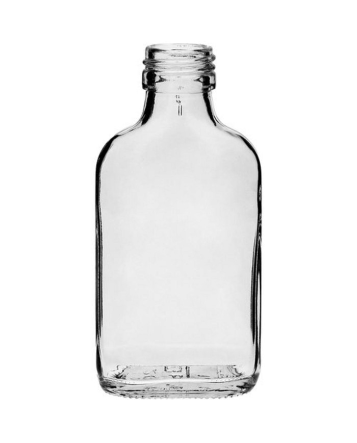 sklenená, na alkohol, číra, ploská, objem 100 ml, výška fľaše 12,7 cm, na závit, bez uzáveru