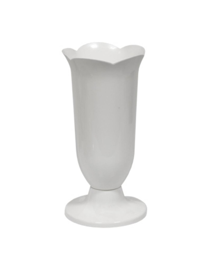 plastová, na okrúhlom podstavci, výška celej vázy 34,5 cm, v hornej časti je tvarovaná ako lupienky kvetu