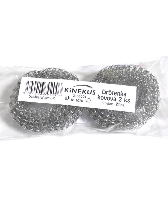 Kovová drátenka na umývanie riadu od zvyškov jedla, najmä pripečených alebo zaschnutých, drezov alebo iných znečistených povrchov. Účinne vyčistí a nepoškriabe. Je vhodná aj na čistenie sporáka, kúpelní a pod. Priemer 6 cm. Sada 2 ks.